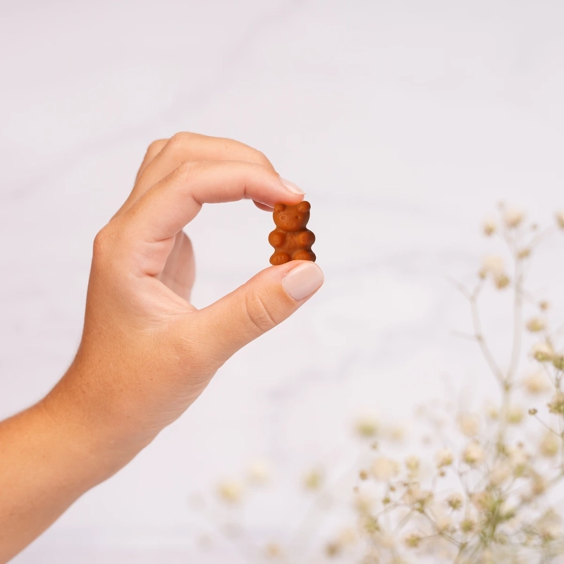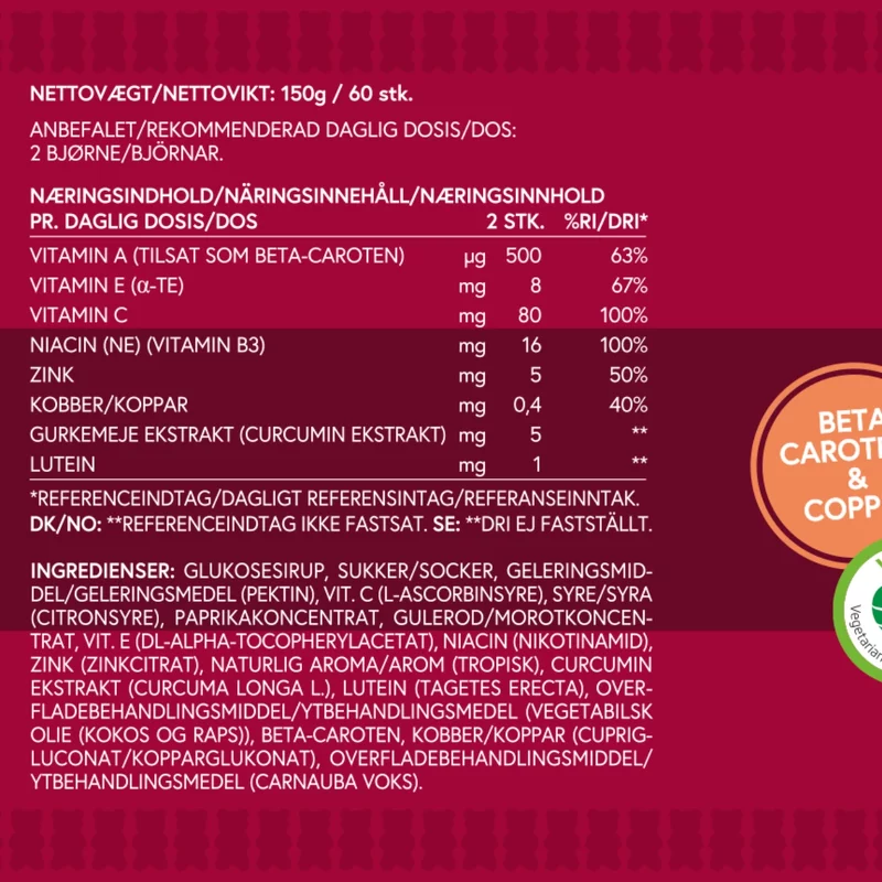 VitaYummy Tan & Glow Tropical er et kosttilskudd for voksne i form av små smakfulle gummibjørner. Gummivitaminene inneholder blant annet vitamin A, riboflavin og jod, som bidrar til å opprettholde normal hud. De inneholder også vitamin C, som er viktig for normalt fungerende hud og beskytter mot oksidativt stress. I denne varianten er kobber tilsatt, som bidrar til normal pigmentering av huden. VitaYummy Tan & Glow er et unisex-produkt som passer for alle hudtyper. Gummivitaminene er produsert med pektin og ikke gelatin, noe som gjør dem spesielt egnet for bruk av veganere. De har også en herlig tropisk fruktsmak, og den vakre naturlige fargen kommer fra paprika og gulrot. I tillegg er de fri for kunstige søtningsmidler, smakstilsetninger og fargestoffer. VitaYummy Tan & Glow er et perfekt alternativ for deg som ikke liker å svelge piller. Forbered huden din på sommersolen med VitaYummy Tan & Glow, som er populær både før, under og etter soleksponering. Fordeler: - Kosttilskudd - Bidrar til å opprettholde normal hud - Forbereder huden på solens stråler - Tropisk fruktsmak - Passer for veganere - Perfekt for de som ikke liker å svelge piller Daglig dose: - 2 tabletter per dag - Anbefales sammen med et måltid for best absorpsjon (fettløselige vitamin A, D og E) - Beregnet for personer over 11 år Næringsinnhold per daglig dose (2 tabletter): - Vitamin A (tilsatt som betakaroten) 500 µg - Vitamin C 80 mg - Vitamin E (α-TE) 8 mg - Niacin (NE) (vitamin B3) 16 mg - Sink 5 mg - Kobber 0,4 mg - Gurkemeieekstrakt 5 mg - Lutein 1 mg Ingrediensliste: Glukosesirup, sukker, geleringsmiddel (pektin), vit. c (l-askorbinsyre), syre (sitronsyre), paprikakonsentrat, gulrotkonsentrat, vit. e (dl-alfa-tokoferylacetat), niacin (nikotinamid), sink (sinksitrat), naturlig aroma (tropisk), curcuminekstrakt (curcuma longa l.), lutein (tagetes erecta), overflatebehandlingsmiddel (vegetabilsk olje (kokosnøtt og raps)), betakaroten, kobber (kobberglukonat), overflatebehandlingsmiddel (karnaubavoks). MERK: Oppbevares tørt, ved romtemperatur og unna direkte sollys. Oppbevares utilgjengelig for barn. Den daglige dosen må ikke overskrides. Kosttilskudd bør ikke erstatte et variert kosthold. Bør kun brukes av gravide og barn etter samråd med lege eller helsesøster.