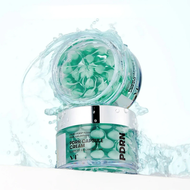 VT Cosmetics PDRN Capsule Cream 100 er en ansiktskrem med en høy konsentrasjon av vegansk PDRN med 100 000 ppm. Kremen kan gi huden intens fuktighet og styrke hudbarrieren med en blanding av ceramider, panthenol og hyaluronsyre, som samarbeider for å beskytte og opprettholde hudens naturlige balanse. Kremen er en kombinasjon av en gel og synlige PDRN-kapsler, som, når de blandes, smelter inn i huden og kan øke hudens kollagendannelse. Den tilsatte hyaluronsyren kan binde store mengder vann og kan dermed bidra til å hydrere huden effektivt og redusere synligheten av fine linjer over tid. PDRN Capsule Cream 100 er beriket med ni typer peptider og en rekke forskjellige typer hyaluronsyre for å gi huden langvarig fuktighet og bidra til regenerering. Ingredienser som niacinamid, sheasmør og squalan kan bidra til å gi næring og fuktighet til huden og støtte en jevn hudtone og ungdommelig glød. Ved regelmessig bruk kan PDRN Capsule Cream 100 gi huden din en god dose fuktighet og støtte hudens barriere og balanse, slik at du kan oppleve huden din som hydrert, glatt og spenstig med en jevn hudtone og tekstur. Fordeler: - Ansiktskrem - Intensivt fuktighetsgivende og nærende - Støtter hudens balanse, barriere og regenerering - Øker hudens kollagendannelse - Reduserer synligheten av fine linjer - Jevner ut hudens tekstur og tone - Fremmer en glattere og mer spenstig hud - Ungdommelig glød - For alle hudtyper - Fri for kunstig parfyme, essensielle oljer og uttørkende alkohol Bruk: - Bruk på renset hud etter eventuell peeling, toner og serum - Masser en passende mengde inn i huden i ansikt og på hals - Kan brukes morgen og kveld Ingrediensliste: Natriumacetylert hyaluronat, polyglyceryl-10 laurat, tripeptid-1, acetyltetrapeptid-2, acetyltetrapeptid-5, kobbertripeptid-1, palmitoyltripeptid-1, palmitoylpentapeptid-4, heksapeptid-11, heksapeptid-9, palmitoyltripeptid-5, etylheksylglyserin, vann, Glyserin, kapryl-/kaprintriglyserid, glysereth-26, dipropylenglykol, niacinamid, 1,2-heksandiol, panthenol, Butyrospermum Parkii (Sheasmør), squalan, glyserylglukosid, karbomer, arginin, polyglyceryl-2-stearat, C13-15-alkan, arakidylalkohol, ammoniumakryloyldimetyltaurat/Vp-kopolymer, glyserylstearat, Melia Azadirachta-bladekstrakt, cetearylalkohol, stearylalkohol, Melia Azadirachta-blomsterekstrakt, behenylalkohol, C12-16-alkoholer, arakidylglukosid, trometamin, Coccinia Indica-fruktekstrakt, adenosin, dimetikon/vinyldimetikon-krysspolymer, pentaerytrityltetra-di-T-butylhydroksyhydrocinnamat, palmitinsyre, hydrogenert lecitin, solanum Melongena (aubergine) fruktekstrakt, xantangummi, ravpulver, Curcuma longa (gurkemeie) rotekstrakt, Ocimum sanctum bladekstrakt, Aloe barbadensis blomstekstrakt, Corallina officinalis ekstrakt, Moringa oleifera frøolje, Simmondsia chinensis (jojoba) frøolje, butylenglykol, glukose, Panax ginseng rotekstrakt, natrium-DNA, dimetylsilanolhyaluronat, hydrolysert hyaluronsyre, hydrolysert natriumhyaluronat, natriumhyaluronat, kaliumhyaluronat, hyaluronsyre, ceramid NP, natriumhyaluronat-krysspolymer, hydroksypropyltrimoniumhyaluronat, natriumhyaluronat, dimetylsilanol.
